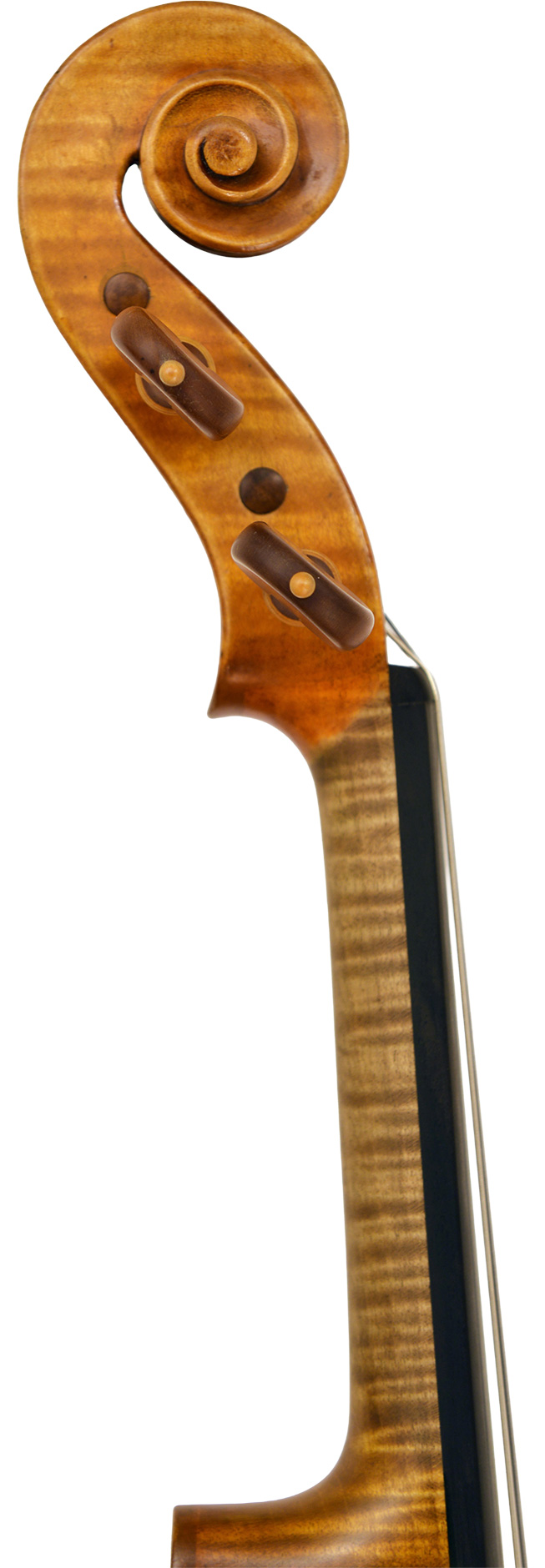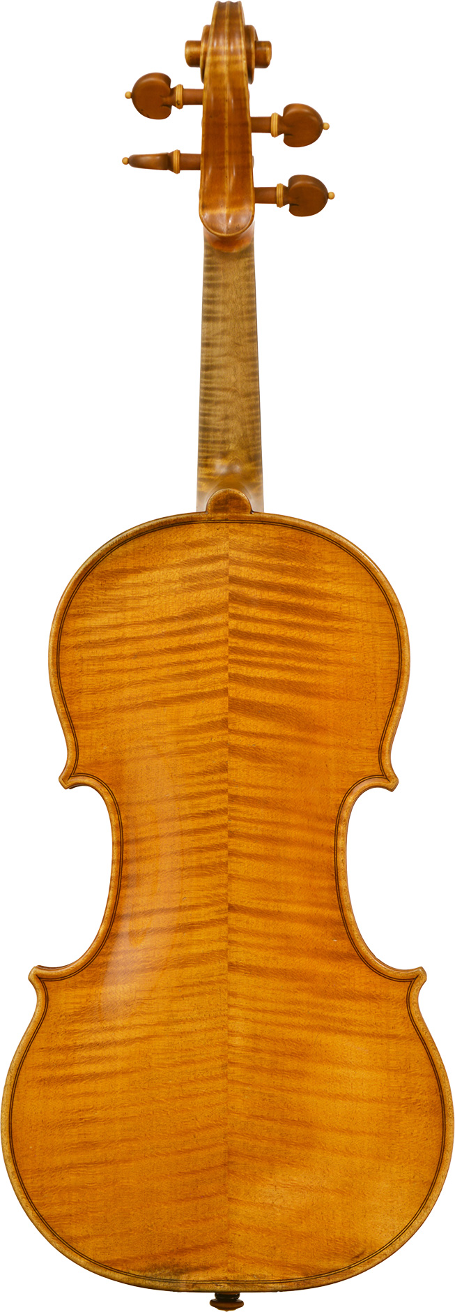 1945年製のこのヴァイオリンには、ポッジ特有の均整の取れた造形美が見られます。アーチは明快でわずかに高く、エッジの処理は極めて繊細です。スクロールには柔らかな抑揚があり、f字孔は縦に引き締まりつつも優雅な開きを持っています。ニスは赤みを帯びたオレンジブラウンで、透明感のある光沢が木目の美しさを際立たせています。
