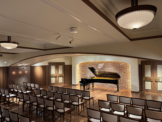 演奏会や収録、展示会、講演、パーティーなど、さまざまな用途にご利用いただけます。館内にはスタインウェイ&サンズ製フルコンサートグランドピアノ(モデルD-274)が常設されており、本格的な演奏にも対応可能です。