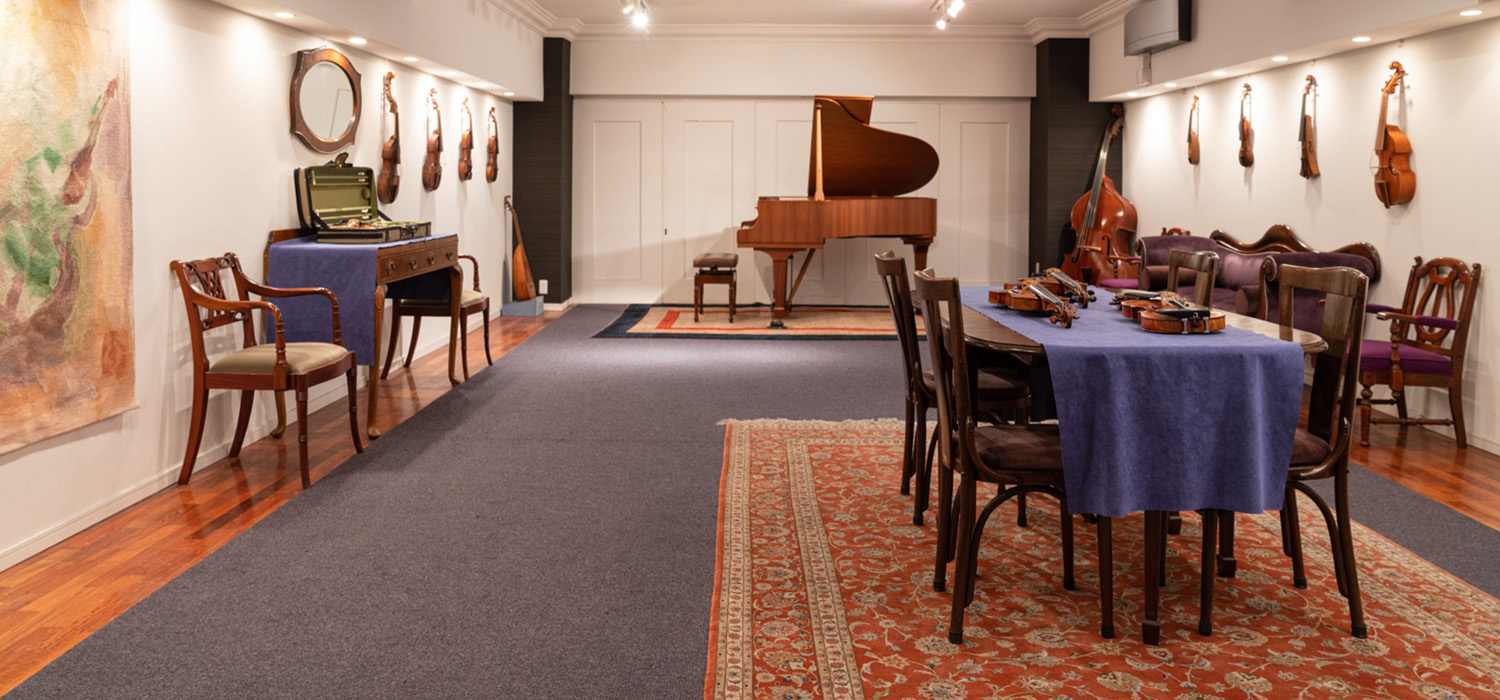 「日本ヴァイオリン アートサロン」は、木彫のスタンウェイのピアノと、アンティーク調の家具、