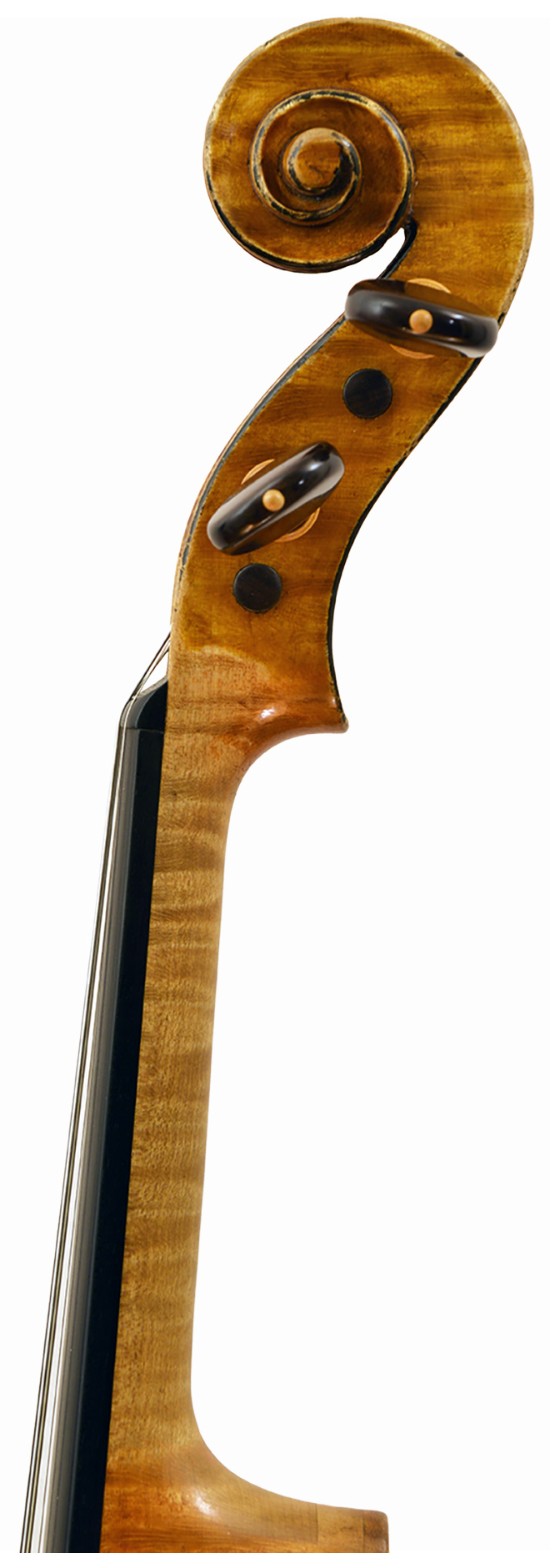 The refined golden colored varnish is one of the characteristics of his later years and adds to the rich expressions. The well-rounded arch, edge work and corners feel like his robust knife work and create dignified beauty of craftwork.
