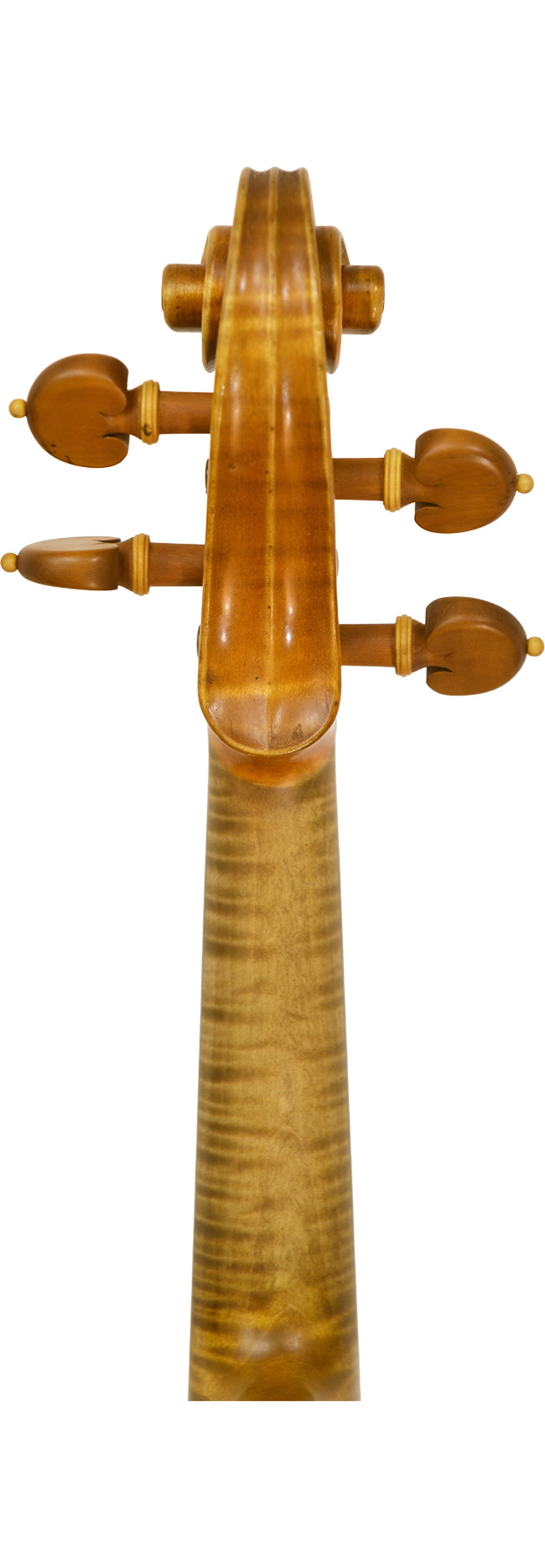1945年製のこのヴァイオリンには、ポッジ特有の均整の取れた造形美が見られます。アーチは明快でわずかに高く、エッジの処理は極めて繊細です。スクロールには柔らかな抑揚があり、f字孔は縦に引き締まりつつも優雅な開きを持っています。ニスは赤みを帯びたオレンジブラウンで、透明感のある光沢が木目の美しさを際立たせています。
